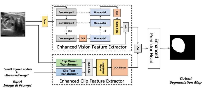 甲状腺癌已成为全球增长速度最快的恶性肿瘤之一,位列第七大常见癌症。人工智能在医学影像技术领域虽然取得了显著进展,且在各类医学影像分析任务中发挥核心作用,但是现有的这些方法仍面临模态冲突、微小病灶与边界分割不佳等问题。为解决上述痛点,本文以基于CLIP的分割模型,提出融入分组通道注意力机制的GCAESeg 网络,构建双分支协同架构。增强型视觉特征提取器采用类U-Net结构的编解码与分层GCA结合,强化器官边界、微小病灶等高频细节,弥补ViT模型空间信息损失;增强型CLIP特征提取器依托文本条件嵌入的视觉-语言模型,捕捉高级语义特征。双分支输出经拼接后输入增强型预测头,通过渐进式融合实现精准分割预测。整体架构为甲状腺结节精准分割提供了新方案,完善了现有技术体系。
