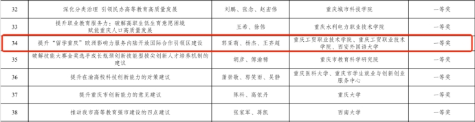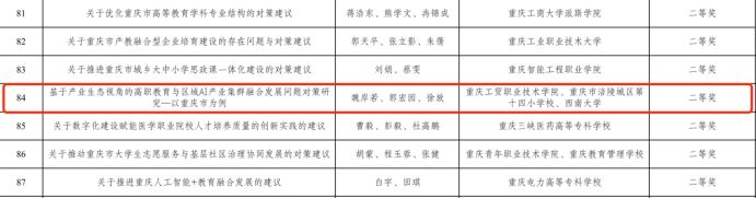 近日,重庆市教育委员会印发《关于2025年教育咨政决策论文获奖情况的通报》(渝教策函〔2025〕18号),我院教师报送的两篇教育咨政决策论文获奖。郭亚萌等撰写的《提升“留学重庆”欧洲影响力服务内陆开放国际合作引领区建设》荣获一等奖;魏岸若等撰写的《基于产业生态视角的高职教育与区域AI产业集群融合发展问题对策研究—以重庆市为例》荣获二等奖。