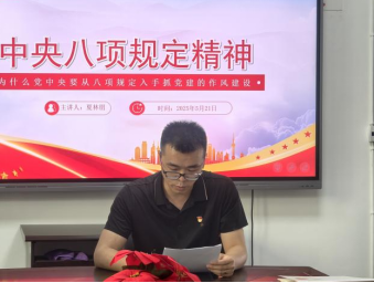 为持续落实深入贯彻落实党中央关于开展中央八项规定精神学习教育的部署和要求,2025年5月21日下午,我院教工学生党支部书记夏林朋在一教531会议室为我院全体党员讲授党课,主题为《为什么党中央要从八项规定入手抓党的作风建设》。